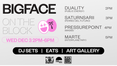 Public Energy is kicking off Art Basel with BIGFACE to celebrate their 1-year anniversary at “BIG ON THE BLOCK”, a collaborative art exhibit featuring local artists courtesy of Miami Arts Society. The entire espresso bar will be transformed into an indoor/outdoor gallery experience with pieces and installations scattered throughout for your viewing pleasure. Notably, the outer patio will be showing off a LIVE mural done by internationally recognized artist RUTAMFI, all while being treated to the sounds of some of Miami’s most prominent curators & selectors: Duality (Public Energy), SATURNSARii (Perreo del Futuro), Pressure Point (Masisi), and MARTE, with all sets being recorded by Miami Community Radio. While you’re exploring, you can enjoy some of the best pastries in the city from our Caracas Bakery pop-up.