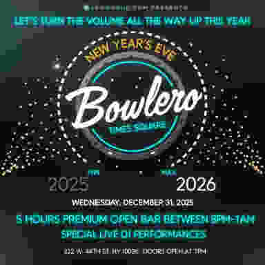 New Year's Eve Party At Bowlero Amp up this New Year's Eve at Bowlero's mega-watt entertainment complex with an impressive, state-of-the-art bowling arena in New York City's Times Square. Bowlmor sets a precedent for the ultimate fun-filled New Year's Eve, ideal for family and friends of all ages, within walking distance from the iconic NYE Ball Drop. Get lost in the expansive venue's diverse deluxe amenities and games that'll throw your NYE into full-throttle party mode. NYE Party Vibe and Amenities Head over to NYE party central in Times Square for nonstop energy at Bowlero's whopping New Year's celebration, which appeals to party-goers of every age. You'll be overflowing with endless drinks during an eventful 5-hour premium open bar, including unlimited non-alcoholic beverages for youngsters under 21. Enjoy delicious bites during a complimentary early evening mini buffet of appetizers and entrees. Get down to the sounds of the DJ, one of NYC's top family-friendly DJs and a guaranteed crowd-pleaser. Watch a live broadcast of the Times Square Ball Drop on high-def screens that'll deliver the electrifying spirit of Times Square without the crowd's clamor just minutes away. At midnight, revel in a complimentary champagne toast (for ages 21 and over) and a breathtaking live countdown to heighten the New Year with pizzazz. VIP Services For an unsurpassable NYE celebration in luxury, add some opulence to your bowling extravaganza by exploring one of many VIP packages that feature table and bottle service, private lanes, unlimited bowling, and more.