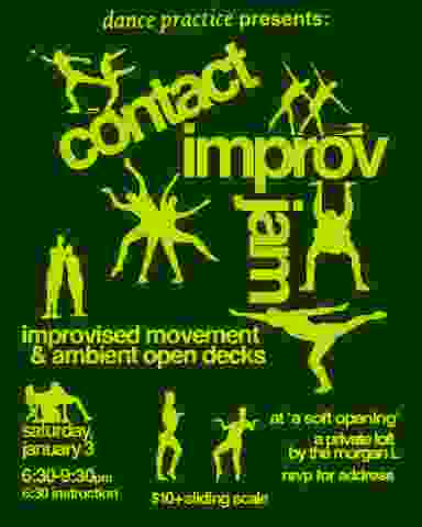all levels! come & go as you please! no partner required! explore movement with various people: switch partners at any time, dance with multiple partners, keep one partner for a while, dance solo, or take a break on the sidelines. disclaimer: however unlikely, contact improv involves the possibility of physical injury. we follow the 1st rule of CI: “take care of yourself first.” by participating, you are responsible for your own safety & well-being. please listen to your body & move consciously. CI is a free-form dance (started in 1972 by Steve Paxton) exploring movement with a partner based on how bodies interact with physics: touch, gravity, balance, momentum & playful exploration. in a jam, expect all sorts of movement: lifts & rolls, “body puzzles,” unexpected timing & perspective-altering positions. we partner into dynamic, in-the-moment duets, tuning into our sensations, the subtle cues of a touch & where the movement wants to go. it’s about staying curious & discovering our natural instincts for improvising. consent: because CI involves touch, we want to be clear that sexual energy is not to be pursued here. attraction & repulsion can be points of internal exploration & exploring a “no” is just as valuable as exploring your “yes.” ambient open decks: movement is accompanied by musical improvisation, sounds that compliment & engage with movement in the room. djs & musicians: dm to signup :) 6:30-7:30pm instruction (highly recommended for beginners) please purchase a separate $5 ticket if you plan on coming for instruction so we can ensure capacity 7:30-9:30pm jam $15 suggested donation ($10 accessibility / $20+ donor) rsvp for address, sent day of