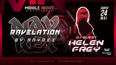 HELEN FREY GUEST DJane pour la 5eme EDITION RAVELATION by NAYREX ✨ Le concept qui cartonne sur Clermont-Ferrand, plongez dans une expérience immersive avec un DJ set en mode Boiler Room.✨ 🎧HELEN FREY🎧 Née en 1991 près de Strasbourg en France, Helen Frey a été bercée dans la Techno/Trance des années 80-90 via les cassettes audio de son père qu'elle écoutait dans un petit magnétophone pour enfants. Elle décide d'apprendre le mix en 2019 après avoir écouté, découvert et observé Adam Beyer et Charlotte de Witte. Rapidement remarquée sur la scène Techno strasbourgeoise, elle a pu jouer aux côtés de grands noms. Dans ses sets Helen Frey mixe les sonorités de la Techno Acid, de la Hard Dance ou encore de la Classic Trance. - Born in 1991 near Strasbourg in France, Helen Frey was rocked in the Techno / Trance of the 80s-90s via her father's audio cassettes which she listened to in a small tape recorder for children. She decided to learn mix in 2019 after listening, discovering and observing Adam Beyer and Charlotte de Witte. Quickly noticed on the Strasbourg Techno scene, she was able to play alongside big names. In her sets Helen Frey mixes the sounds of Techno Acid, Hard Dance or Classic Trance. 🌟 Line-Up : -HELEN FREY (Guest DJane) -NAYREX pour un warm-up et un closing calibré 🔹 Date : Samedi 24 Mai 2025🔹 Lieu : Middle Night🔹 Horaires : 23h30 - 6h REVALATION By NAYREX — Là où les battements résonnent plus fort que jamais