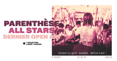 L’été n’est décidément pas terminé chez nous, et on compte bien en profiter jusqu’au bout. 💥 Et parce qu’on vous aime : 100 places à 3 € seulement pour célébrer ça ensemble 🫡 ❤️ Alors, prêt·es à tout donner pour ce dernier open air ? ▬▬▬▬▬▬▬▬ 🤟 FORMAT 2 SCÈNES 🤟 ▬▬▬▬▬▬▬▬▬ La team de solides soldats qu’on appelle à la barre, prend les commandes de l’Agora ET du Fait Social EN MÊME TEMPS. Vous n’allez plus savoir où donner de la tête, mais une chose est sûre, c’est qu’elle sera toujours à la fête ! 🔥 SCÈNE AGORA (18h - 01h) ▸ House to Boum ⭐️ SCÈNE FAIT SOCIAL (20h - 02h) ▸ Trance to Techno letzgo ▬▬▬▬▬▬▬▬ ✨SHINE BRIGHT LIKE A DIAMOND✨ ▬▬▬▬▬▬▬▬▬ Confettis, écran géant, boule à facette XXL, et autres petites folies à venir pour vous en mettre la plein la vue ▬▬▬▬▬▬▬▬ ‼️ 𝘼 𝙇𝙄𝙍𝙀 𝙄𝙈𝙋𝙀𝙍𝘼𝙏𝙄𝙑𝙀𝙈𝙀𝙉𝙏 Le Quartier Libre se veut être un lieu inclusif qui accueille toutes les communautés. Aucun comportement discriminatoire, haineux ou violent (racisme, sexisme, homophobie, transphobie, harcèlement, etc.) ne sera toléré, que ce soit parmi l’équipe ou le public. Tout propos ou geste discriminatoire entraînera une exclusion immédiate. En cas de problème du type harcèlement ou agression, vous pouvez vous adresser à notre équipe bar ou à nos agents de sécurité qui vous prendront immédiatement en charge. Prenez soin de vous et des autres ❣️ 📍 𝙋𝙊𝙄𝙉𝙏 𝘼𝘾𝘾𝙀𝙎 AGORA, espace extérieur couvert dans le Quartier Libre de Rouen LE FAIT SOCAIL, espace intérieur dans le Quartier Libre de Rouen 1 rue Malouet 76 100 Rouen Accès en F1/F7 arrêt Champlain ou en métro arrêt Joffre-Mutualité ⌚️ 𝙋𝙊𝙄𝙉𝙏 𝙃𝙊𝙍𝘼𝙄𝙍𝙀𝙎 Début du son : 18h Fin du son : 1h45 ⚠️ Toute sortie est dénitive