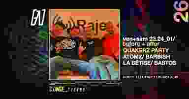**QUAKERZ PARTY — AFTER House / Electro / Techno / Acid Techno** L’after prolonge la soirée dans un registre plus soutenu, avec une continuité musicale assurée par les mêmes artistes. Le format permet des séquences plus longues et une intensité renforcée, adaptées aux dernières heures de la nuit. Les sélections s’orientent vers des grooves plus appuyés, des textures acides et des rythmiques répétitives, tout en conservant une cohérence entre house, electro et techno. Un after pensé pour maintenir le dancefloor actif jusqu’au matin, dans un esprit résolument underground. Tarif After : 10€ — entrée + vestiaire + shot offert.