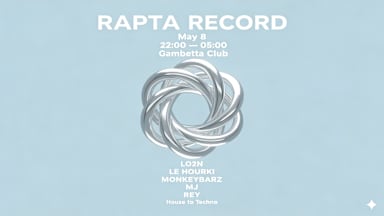 RAPTA, LIBERTÉ, INCLUSIVITÉ, PLAISIR, MOUVEMENT, MUSIQUE, INTROSPECTION, SAFE. 08.05.26 - GAMBETTA CLUB - 22H / 05H 104 RUE DE BAGNOLET - PARIS ----- LINE UP: MONKEYBARZ MJ LE HOURKI LO2N REY