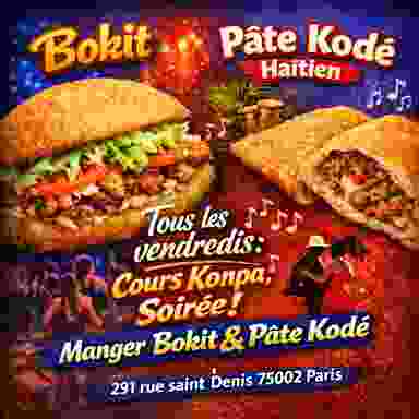 Tous les vendredis : Cours de konpa pour apprendre à danser Soirée konpa gratuite pour les experts Possibilité de manger des 7€ Un bar à disposition