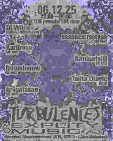 –for & by– hardcore lovers, noisy bats, & –not only– local queer gems. w/ hybrid sets & weird scenographies. Brussels - Recyclart, Manchesterstraat 13/15, 1080 Sint-Jans-Molenbeek Saturday, December 6, 2025 22:00 - 05:00 €10 (presale) / €13 (at the door) On December 6, we’ll be slowly approaching the winter solstice and the longest nights - the perfect time to gather bodies and spirits. It will also be the last club night of the year at Recyclart. For the occasion, collectives Turbulences and Explity Music join forces to celebrate both endings and new beginnings in a mutant party: a hybrid performance, live acts, and hardcore DJ sets pushing beyond sunrise. We’ll also be celebrating the release of DJ Würm’s EP Anachronism, soon to be out on Explity Music. May the night be long and the party kind to all beings, in front of the speakers and across the dancefloor. turbulences: disorderly, noisy agitation. disturbances that disrupt. Since March 2024, Turbulences has gathered the untamed energies of Brussels nightlife, spotlighting minoritized artists from the alternative scene in its line-ups. explity: the point of convergence between expectations and reality, where everything becomes blurry, the thin border between day and night. Explity Music is an independent label based between Paris and Corrèze, promoting a narrative, experimental, and avant-garde vision of hardcore and contemporary electronic music. LINE-UP essence:release (hybrid live) DJ Würm (live) Karlfroye (DJ set) KimberlaID (DJ set) Nouminouw (DJ set) Talita Otović (live) TO4GETASAP (DJ set) SOLIDARITY TICKETS We have a few free tickets for those who can’t afford one: write to us at explity@outlook.com Visuals by Claude Murder and Karlfroye