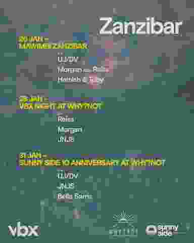 Three events three crews. 26 JAN - VBX x SSFx Why?bot at Mawimbi Page 28 JAN- VBX takeover at Why?not Showcasing the essence of Amsterdam in Zanzibar 31 JAN- Sunny side 10th anniversary at Why?not Celebrating a decade of the SSU crew