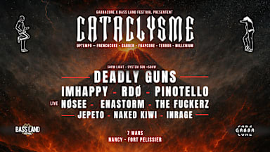 ⚠️ INFOS ESSENTIELLES ⚠️ 📅 Date : 7 mars 2026 🕗 Horaires : 20h – 4h30 📍 Lieu : Hangar du Fort Pélissier Lieu-dit Fort Pélissier Terre, Vaine – 54550 Bainville-sur-Madon 🔥 CATACLYSME 🔥 Uptempo – Frenchcore – Gabber – Frapcore – Terror – Millennium Prépare-toi pour une nuit Gabber → Hardcore → finish Uptempo, un retour aux sources, brutal, sans concession. Pour la première fois, Gabbacore débarque vers Nancy, dans un warehouse de plus de 2000 m², en collaboration avec Bass Land Festival, bien connu dans la région pour ses soirées XXL. Bass Land Festival a fait vibrer toute la région en 2025, en remplissant le Zénith de Nancy et le Fort Pélissier avec des bookings comme Hysta, Major Conspiracy, Remzcore, GPF et bien d’autres. 🔊 LINE-UP • Deadly Guns • Imhappy • RDO • Pinotello • Enastorm • The Fuckerz • Nosee • Jepeto • Naked Kiwi • Inrage 🍻 SUR PLACE • Bar avec prix attractifs (bières de sélection) • ❌ Pas de vente d’alcool fort • Stand prévention & premiers secours • Stand nourriture • Coins chill intérieur & extérieur • Stand Flügel • Vestiaires disponibles ⚠️ Toute sortie est définitive ⚠️ 👥 Public : 16+ (accompagnement requis pour les mineurs) 🏳️‍🌈 LGBTQIA+ friendly aucune discrimination tolérée 🚫 Tout comportement déplacé ou irrespectueux entraînera une exclusion immédiate sans remboursement 🚗 Distances : • 15 min de Nancy • 1h de Metz • 2h du Luxembourg • 3h30 de la Belgique • 1h45 de Strasbourg • 2h15 de Mulhouse • 2h45 de Reims • 2h de Dijon
