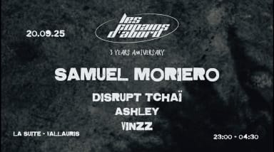 🎉 3 YEARS ANNIVERSARY WITH SAMUEL MORIERO 🎉 Cela fait déjà 3 ans que Les Copains d’Abord font vibrer vos nuits. Trois années d’énergie, de danse, de partage et d’instants gravés à jamais. Rien de tout cela n’aurait été possible sans vous, notre public, notre famille. ❤️ Pour célébrer comme il se doit cet anniversaire, nous réunissons ceux qui incarnent l’âme de nos soirées : nos résidents : ASHLEY, DISRUPT TCHAI et VINZZ. Ils seront épaulés de près par l'étoile montante de la scène Hard Techno internationale : SAMUEL MORIERO. Il incarne le côté plus dur et plus sombre de DJSM en se concentrant sur une hard techno pure et implacable, avec des kicks puissants et des basses entraînantes . Pas de compromis, juste de l'énergie brute. 👉 Rendez-vous pour souffler ensemble nos 3 bougies et écrire une nouvelle page de cette aventure collective. Merci à vous d’avoir fait de ce projet une véritable communauté. L’histoire continue… 🚀 🎟️ PLACES LIMITÉES – Réserve vite ton billet pour assurer ta place sur le dancefloor ! Restez connectés et suivez-nous sur les réseaux sociaux pour ne rien manquer de nos prochains événements et surprises. From les Copains d'Abord with ❤️ ---------- Infos pratiques ---------- 📅 20/09/2025 🕒 Horaires : 23h - 4h30 💵 à partir de 13,99€ 🎟️ Billetterie : - Super Early : 13,99 € - Early : 15,99 € - Regular : 18,99 € - Last : 21 € - Sur place : 25€ 🎶Line Up : - ASHLEY - DISRUPT TCHAI - SAMUEL MORIERO - VINZZ Sonorised by PMP