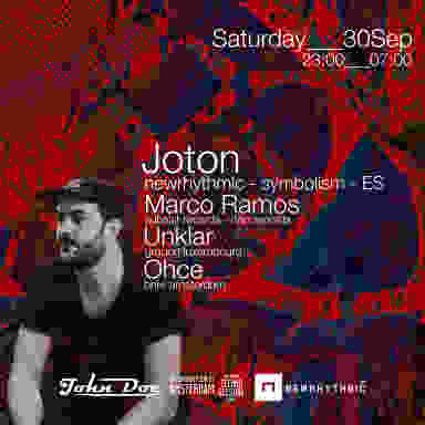 His label `Newrhythmic´ has been more than 15 years supporting high-octane techno by native and foreign artists. Joton’s tracks have been published by labels such as Fabric, Symbolism, Planet Rhythm, Format, Dynamic Reflection, More Than Less ... and have been charted and screened by artists of the great size of Ben Klock, Dvs1, Rodhad , Dave Clarke, Ben Sims, Oscar Mulero, Adam Beyer, Surgeon, Truncate…. As a DJ, he has evolved from his beloved and traditional vinyl to the current digital format. Thanks to it, Jotón enriches his sessions by providing an added boost to his innate ability to connect it to the dance floor.