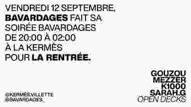 POUR LA RENTRÉE BAVARDAGES FAIT SA SOIRÉE BAVARDAGES VENDREDI 12 SEPTEMBRE DE 20:00 À 02:00 @ KERMÈS / 211 AVENUE JEAN JAURÈS, 75019 AVEC GOUZOU MEZZER K1000 SARAH.G + OPEN DECKS TICKETS > PRIX TTC 10€