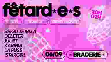 ⭐️ fêtard•e•s : personne aimant faire la fête, cherchant le plaisir et parfois jusqu'à la débauche 🤫 la première de fêtard•e•s se déroulera le 06 septembre 2025 au SUPERCUTE et tu ne veux pas manquer ça 🔋 fêtard•e•s c'est une soirée trance qui ne s'excuse pas d'être queer et qui le revendique lors de l'événement de le plus émblématique de lille : LA BRADERIE. rejoins nous pour une fête folle qui nous rassemblent tous•tes ! 📋 AU PROGRAMME : des dj sets enflammés par : - BRIGITTE IBIZA (