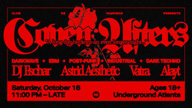 “A long day beckons an even longer night…” There’s a lot happening on Saturday, October 18th. From the Little 5 Points Halloween parade and festival during the day to the Patriarchy and The Cult tour later in the evening… … but what’s there to do 𝘢𝘧𝘵𝘦𝘳𝘸𝘢𝘳𝘥𝘴, when the moon becomes full of light and the sky dims as black as night? Why, you join us at Coven Afters at Underground Atlanta, of course! 😉 Let DJ Eschar, Astrid Aesthetic, Vatra, and Alayt guide you into the late hours of the night with excellently-curated darkwave, EBM, post-punk, industrial, and dark techno DJ sets! And as always, we’ll be handing out free Topo Chico products at the door to help you beat the heat on the dance floor, and Underground’s bartenders will be slinging drink specials, cocktails, beer, and non-alcoholic beverages all night long! And since this is an afters event, we’re starting at 11:00PM and going ‘til even later… 🦇 $12 Early Bat tickets are now on sale on Shotgun, but grab yours quickly because these are going to go fast! Tickets will also be sold at the door for $20 on the night of the event based on availability. See you in the late hours of the night October 18th, vamps! 🌙 Club de Vampiros presents… Coven Afters with DJ Eschar, Astrid Aesthetic, Vatra, and Alayt Saturday, October 18th 11:00PM Ages 18+ Underground Atlanta 50 Upper Alabama St Atlanta, GA 30303 Ride-sharing is encouraged! ALL–BLACK OR GOTH/ALTERNATIVE ATTIRE IS MANDATORY! 🖤 ⚫️ Posters designed by design.byjad 🟣 Tickets sold by Shotgun 🟡 Proudly sponsored by Topo Chico