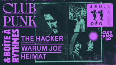 The Hacker, fan inconditionnel de boîte à rythmes devant l'éternel, nous avait soufflé l'idée à l'oreille : j'adorerais jouer sur un Club Punk avec Warum Joe. Ainsi soit-il. Notre producteur favori du côté obscur de la techno music prendra les platines, armé des plus belles pépites de sa collection de disques toute personnelle : synth punk, cold wave, electro... vous allez sombrer sur le dancefloor !!