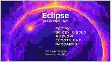 On October 7th, experience the spectacular convergence of light and darkness at “Eclipse”. As the sun sets and the moon rises, our immersive party transforms to take you on an adventure that transcends the boundaries of day and night. As the celebration begins, bask in the golden hues of the sun while the music builds towards a crescendo. The pinnacle of "Eclipse" arrives as day turns to night and the moon blankets the sun, engulfing us in an ethereal atmosphere of pulsating light and sound. As the night continues and the eclipse wanes, the party transforms once again to invoke the power of the moon and the dark beauty of the starry night sky. Whether you prefer the vibrant energy of the day, the mysterious allure of the night, or the mystical twilight of the eclipse, this unique event promises an unforgettable celestial journey. “Eclipse” is a dynamic sensory experience with an evolving theme. The lighting, visuals, and the music will change throughout the event to reflect scenes from the day, the night, and the ineffable eclipse. Expect to hear an evolution of music genres through sunny house grooves, to deep ethereal beats, to energetic and melodic techno. “Eclipse” will feature professional dancers courtesy of Dark Phoenix Entertainment, a powerful sound system from Grand Ancestor Sound, a complimentary face & body glitter booth, a bracelet crafting station, and a chill patio space to connect with friends! Set Times: 9 - 10 | Mazlow 10 - 12 | Be Ezy b2b Solo 12 - 2 | Fátima 2 - 3 | Coyote Cat b2b Brodango