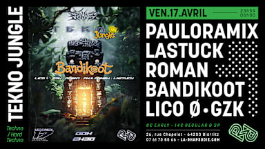 EPIKNES & LA RHAPSODIE présentent : TEKNO JUNGLE ▬▬▬▬▬▬ GUESTS PAULORAMIX LASTUCC ROMAN BANDIKOOT LICO ⏀ GZK ▬▬▬▬▬▬ VIBES HARD TECHNO TEKNO ▬▬▬▬▬▬ BILLETTERIE Early : 8€ • Places limitées // L'achat d'un billet en ligne vous sert de coupe file à l'entrée Regular : 14€ • Équivalent au tarif sur place, l'achat d'un billet en ligne vous sert de coupe file à l'entrée Sur Place : 14€ ▬▬▬▬▬▬ INFOS PRATIQUES Tous les comportements discriminatoires, tels que le racisme, l'homophobie, la transphobie, le sexisme et la haine, sont strictement interdits dans notre établissement. — Événement interdit aux mineur·es — Pièce d’identité obligatoire : Carte d’identité, passeport, permis de conduire (photo non-acceptée) Pour venir à La Rhapsodie : Ⓑ Bus Ligne 5 : arrêt Z.A. Biarritz (devant le lieu) Ⓑ Bus Lignes 6, 38, 46, 51, 52, 108 : Arrêt Gare de Biarritz (à 500 mètres du lieu) Ⓥ Velo : parking à vélo Code promo pour venir avec les vélo en libre service Pony : LARHAPSODIE2024 Ⓥ Voiture : parking relai Iraty (à 280 mètres du lieu)