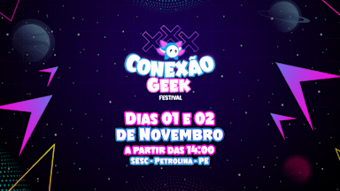 🔗 Bem-vindo à página oficial de ingressos do Festival Conexão Geek! 🔗 Prepare-se para viver dois dias incríveis no maior evento geek do Vale do São Francisco! O Festival Conexão Geek acontecerá nos dias 01 e 02 de Novembro, das 14h às 22h, no SESC Petrolina, e promete uma programação épica para fãs de todas as galáxias! 🎉 O que te espera: • Atrações inéditas no vale; • Oficinas e workshops com temas criativos; • Concurso de Cosplay e Desfile Cosplay para brilhar com seu personagem favorito; • Concurso de K-pop com performances eletrizantes; • Arena Gamer com jogos e desafios imperdíveis; • Campeonatos de RPG, YU-GI-OH! e Pokémon pra mostrar suas habilidades; • Feira de Empreendedorismo Geek com produtos únicos e criativos; • Espaços temáticos de séries, filmes e animes para fotos e experiências imersivas; • E muito mais surpresas pra quem respira cultura geek! 💥 Não fique de fora dessa aventura! Garanta já seu ingresso e venha fazer parte da conexão geek mais animada da região!