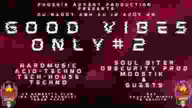 Phoenix Advent Production presents Good Vibes Only #2 9/10/11 août 2022 | PARIS -LE GAMBETTA CLUB —————————————————— TECHNO | ACID TECHNO| TECH HOUSE | TEKNO | HARD MUSIC —————————————————— ☞ Billets disponibles ici : Le Phoenix ressent toute la tristesse et les angoisses des terriens! Il préfèrerait les voir sourire et s'amuser, c'est pour cela qu'il a décidé de vous convier à 4 jours de fête!!!! Durant 4 jours, venez vous amuser, rencontrer du monde, les orgas, le staff les djs ou tout simplement danser sur les sets de nos djs!!!! UNE seule et unique règle: CHILL & GOOD VIBES ONLY —————————————————— ★★ LINE-UP ★★ annonced soon ———————————— ▷ MARDI 9 AOUT 20h - 5h ► 20h - 23h: Soul Biter ► 23h - 00h: ► 00h - 02h: Obscurity Prod ► 02h - 04h?: Dr Hakken ▷MERCREDI 10 août 20h - 4h ► 20h - 22h: soûl biter ► 22h - 00h0: calliste ► 00h - 4h: surprises guests ▷JEUDI 11 AOUT 20h - 4h ► 20h - 23h: soûl Biter ► 23h - 01h30: Obscurité Prod ► 1h00 - 4h: Moostik —————————————————— ★★ BILLETTERIE ★★ —————————————————— ☞ Billets disponibles ici : —————————————————— ★★ INFOS PRATIQUES ★★ —————————————————— Gambetta club 104 Rue de Bagnolet Paris 75020 —————————————————— ★★ COMMENT VENIR ? ★★ —————————————————— Gambetta club MÉTRO : L2 Alexandre dumas L3 Porte de Bagnolet L9 Porte de Montreuil —————————————————— ★★ NOS PARTENAIRES ★★ —————————————————— Ultimate gabber :