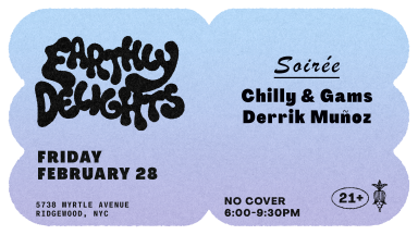 Friday, Feb 28th the Soirée crew makes their Earthly Delights debut as they bring their vibes and selections to kick off the weekend. Catch Soirée founder Derrik Muñoz warm-up the vibes.Followed by Soirée residents Chilly & Gams and their revered record bags and jamz!