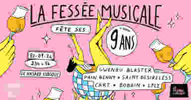 🍑🍑🍑 SPANKY BIRTHDAY 🍑🍑🍑 9 ans ! 9 ans qu'on met des Fessées Musicales dans tous les clubs de la capitale et on ne s’arrêtera pas de sitôt !! Pour fêter ça, on vous prévoit une belle teuf au Hasard Ludique en format Boiler Room pour plus de proximité 🔥 Entre fesseurs, on s'enchainera derrière les platines pour une soirée empreintée de House et de soleil ☀️💿 L'occasion également de vous présenter notre super nouvelle fesseuse du collectif : Gwenou Blaster 💣 Bien évidemment, notre crew des Boules à Paillettes sera là pour illuminer vos doux visages pendant la soirée en + d'une scénographie à la hauteur et d'autres petites surprises fessues 🥃✨🎉🎈 Line-up : 💌 Bobbin 🧨 Cart ❤️🔥 Gwenou Blaster 💥 Lplz 👄 Pain Benny 💣 Saint Desireless ✨ Stand Paillettes by Boule à Paillettes 🍑 La Fessée Musicale : La Fessée Musicale, c'est une belle équipe générateur d'événements fess(tifs). Actifs depuis maintenant 9 ans, c’est à chaque fessée une vraie expérience chaleureuse et pailletée qu’ils proposent dans les plus beaux clubs de Paris. 6 Fesseurs derrières les platines, c’est 6 plongeons dans le spectre de la House, la Fessée se balade dans les recoins les plus sombres et les plus lumineux du genre, pour un mélange éclectique explosif et finement diggé.