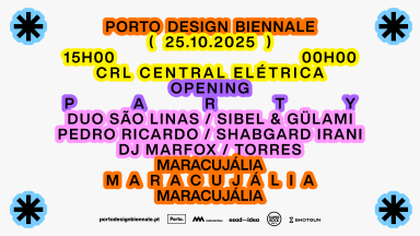 Opening Party!!! A Porto Design Biennale junta forças com a Maracujália para transformar o "tempo presente" numa recordação para o futuro. A Central Elétrica do Porto será o palco de uma tarde de desconexão, imersão, euforia e alegria. Um evento que celebra a qualidade do tempo, a partilha e a criação de novas relações.