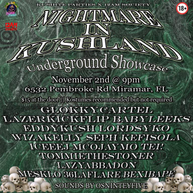 November 2nd joins us in a Nightmare in Kushland where we'll klose out the Halloween Szn with an Legendary rage banger. Performances from the best independent musicians of South Florida.