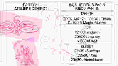 Cette année il n’y aura pas une, mais deux Fêtes de la Musique ! Dans un espace extérieur et un espace intérieur imaginés par nos scénographes, vous retrouverez nos DJs résident•es et invité•es de marque, mais également un bar et une cantine à des prix tout doux ! Entre techno, minimal, baile funk et hyper pop, venez danser, boire et manger toute la journée avec nous. On a hâte de vous retrouver de 12h à 1h aux Ateliers Diderot, 64 rue Denis Papin 93500, Pantin Line up : Open Air 12h - 18h30 : - Timea - DJ Black Magic https://www.instagram.com/radioblackmagic/, - Xea https://soundcloud.com/user-405332201/sets/dj-vie - Muleke https://soundcloud.com/user381416133/mlk_01-1 19h00 : McLovin (Live) https://soundcloud.com/mclovin-nshit 20h : Lowkey x 808ADAM (Live) https://www.youtube.com/@adamsupports 21h00 : Subterra (Busticaccia x Iminthebuilding) https://soundcloud.com/busticaccia 22h30 : Xea https://soundcloud.com/user-405332201/sets/dj-vie 23h30 : Akrimirkamir on.soundcloud.com/nNMiWWQU1FFZHm7MA Au menu : Sandwichs : - courgettes, ricotta, thym, pesto - aubergines, tomates confites, mozza - poivrons grillés, crème de poivrons, aïoli à la harissa Tartes: - tarte citron verveine - tarte abricot romarin La totalité des bénéfices générés par PARTY2 ! sera entièrement employée à soutenir des événements et des productions artistiques de jeunes créateurs.ices. Ici comme cela devrait être le cas partout ailleurs, les comportements oppressifs ne seront pas tolérés. Nous vous rappelons, bien que cela soit évident, l'importance du respect et du consentement. Tout comportement abusif, harcèlement ou agression, qu'elle soit verbale, physique ou sexuelle, est strictement interdit. Si vous êtes témoin d'un comportement inapproprié ou si vous vous sentez en danger, tournez-vous vers un membre de l'équipe de Partie2. Profitons tous.tes ensemble de cette soirée dans le respect et la bienveillance ! CB et cash acceptés Vente de billet sur place Les Ateliers Diderot : 62-64 rue Denis Papin, Pantin, Île-de-France, 93500 METRO Aubervilliers - Pantin Quatre Chemins - ligne 7 RER Pantin - RER E BUS La Pérousse (170, 330, 249) Station vélib’ à deux pas.
