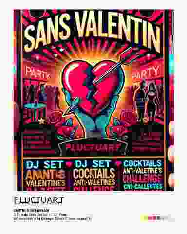 Cette année, vous en avez marre des dîners romantiques et des clichés de la Saint-Valentin ? Venez célébrer une soirée totalement différente à Fluctuart, pour une "Sans Valentin" qui met l'accent sur la liberté, la convivialité et le lâcher-prise. Oubliez la pression des fleurs, des cœurs et des chocolats, et rejoignez-nous pour une soirée fun et décalée, dans un cadre unique à Paris. Fluctuart vous invite à redéfinir la Saint-Valentin avec une soirée alternative où l’amitié, la fête et les bonnes vibes sont à l’honneur.