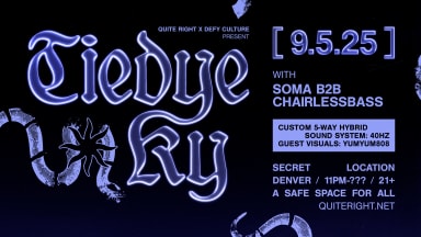 Quite Right & Defy Culture Present: Tiedye Ky Fri Sept 5th, 2025 featuring: Tiedye Ky Soma b2b Chairlessbass +Special Guests Bass/Garage 11pm-??? Merch, Beverages, Snacks and items you need for a late night will be available. Secret location, Denver. 5 minutes from RiNo and 9 minutes from Downtown. 21+ w/ Valid ID only. No Exceptions Location information will be sent to ticket holders.