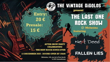 The Vintage Gigolos present: The Last One Rock Show! Get ready for a night of pure rock energy with Next Deed, Fallen Lies and of course The Vintage Gigolos , followed by an afterparty that keeps the music alive until 03:00.