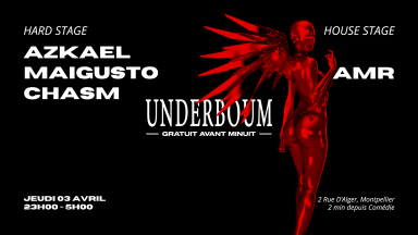 UNDERBOUM PRÉSENTE EURODANCE TO HARDTECHNO AVEC DEUX SCÈNES EN PLEIN CŒUR DE MONTPELLIER ! 💃🏻 🔥 Scène HARD TECHNO : Découvrez des talents montants de la scène 🧌 🔊 AzKaël @azkaelx 🔊 Maigusto @maigusto_music 🔊 Chasm @chasm.techno 🎵 Scène HOUSE : Plongez dans des vibes envoûtantes 👀 🔊 Amr @amr_ofc 🎉 Au programme : Stand de tatouage Stand de strass dentaires Plein de goodies à découvrir 📍 Ça se passe au @boumboum_montpellier, à 2 minutes de la Place de la Comédie, de 23h00 à 05h00 ! 🎟️ ENTRÉE GRATUITE AVANT MINUIT (tickets limités disponibles sur la billetterie un jour avant l'évènement) 💸 Entrée à partir de 5,99 € en ligne (7 € sur place) UNDERBOUM est un espace d’expression, de respect et de liberté, où la diversité et les différences sont célébrées. Tout comportement contraire à nos valeurs (homophobe, transphobe, raciste, misogyne, xénophobe, insultant...) entraînera une exclusion immédiate de tous nos événements.