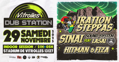 STADIUM, WE’RE BACK ! VITROLLES DUB STATION #2 Après une première session mémorable, Vitrolles Dub Station revient en force à l’intérieur du mythique Stadium de Vitrolles ! RDV le samedi 29 novembre 2025 pour une nuit entière de DUB au coeur du cube, de 21h à 05h du matin. Pour vous faire vibrer, un line-up taillé pour les amateurs de basses puissantes et de sélections percutantes : 🔊 Iration Steppas – Légende UK, pionnier du dub futuriste, prêt à retourner le Stadium.