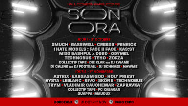 👻 SONORA : HALLOWEEN EDITION 🔊 HARD TECHNO & TECHNO 📍 BORDEAUX - PARC DES EXPOSITIONS 🗓️ 31 OCTOBRE & 1er NOVEMBRE 2025 Le Hall 3 et 4 du Parc Expo en sueur. On t'explique pourquoi. ◻️◻️◻️ FORMAT SPÉCIAL ◻️◻️◻️ Sonora : La plus grosse soirée hangar de France revient à Bordeaux pour une édition Halloween exceptionnelle. RDV pour 2 soirées techno, hard techno, trance et techno mélodique dans une ambiance XXL. ◻️◻️◻️ CE QUI VOUS ATTEND ◻️◻️◻️ ⛓️ ⁠ ⁠2 hangars de 12 000m² et 8 000m² ⛓️ 400m² d'écrans LED ⛓️ 14 monolithes LED à diffusion 360° ⛓️ ⁠Un système son surpuissant ⛓️ ⁠Des lightshows impressionnants ⛓️ ⁠Une ambiance immersive ◻️◻️◻️ PROGRAMMATION XXL ◻️◻️◻️ •⁠ 𝗝𝗢𝗨𝗥 𝟭 | VENDREDI 31 OCTOBRE •⁠ - De 17h à 04h I Hate Models 'Face II Face' A/V show 2much Basswell Creeds Odymel Kas:st Miss Bashful x DBBD Fenrick Teho Zorza Technobus DJ Schnake Die Klar b2B DJ Kwame DJ Caline b2b DJ Football •⁠ 𝗝𝗢𝗨𝗥 𝟮 | SAMEDI 1er NOVEMBRE •⁠ - De 18h30 à 04h Astrix Trym Vladimir Cauchemar Holy Priest Rivo Sköne Zapravka Leblanc Hysta Eargasm God Technobus ◻️◻️◻️ INFOS PRATIQUES & ACCÈS ◻️◻️◻️ 📍 Parc des Expositions de Bordeaux 🗓️ Vendredi 31 octobre : 17h - 04h 🗓️ Samedi 1er novembre : 18h30 - 04h 🔞 Réservé aux personnes majeures 🚫 Sorties définitives