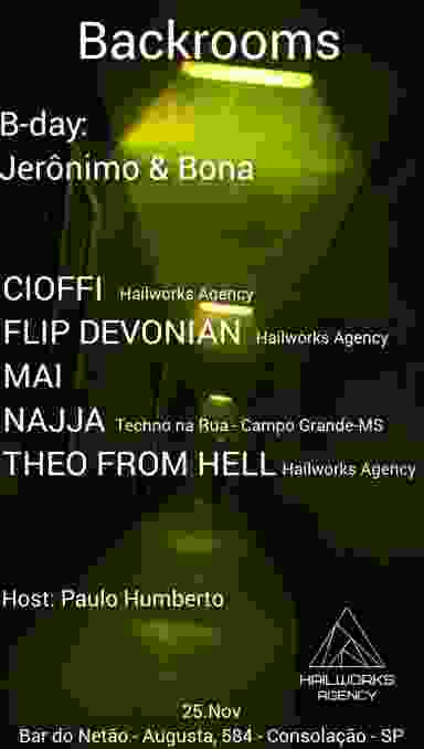 Fomentando o Raw Techno na noite paulista, a festa Backrooms volta para sua terceira edição, trazendo nomes como Flip Devonian (Hail The Light), Mai e NAJJA (Techno na Rua) . Para completar o time, nossos residentes Cioffi e Theo From Hell irão mostrar as novidades de suas pesquisas músicais.