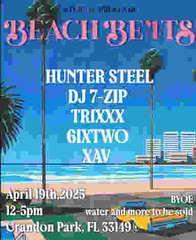 XTURNAL PRESENTS: BEACH BE4TS Our Fourth Installment of Beach Beats is here. And we’re taking it to Crandon Park on April 19th! FREE ENTRY! • 5 Hours • 5 DJ’s • BYOE • Water + Extras will be sold. HUNTER STEEL DJ 7-ZIP XAV 6IXTWO DJ TRIXXX THE TRIPP