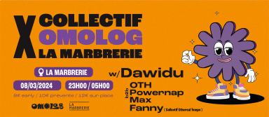 Pour sa première date à la Marbrerie, Omolog invite l'inimitable Dawidu pour un set éclectique dont lui seul a le secret.