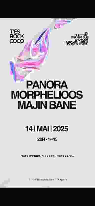Bienvenue pour le come back au t’es rock coco de Morphelioos, Majin Bane et Panora. Ce mercredi, vous pourrez vibrer des 20h en techno, qui s’accélérera en hardtechno puis en gabber, hardcore, frenchcore; de quoi faire trembler le t’es rock coco une nouvelle fois pour cette troisième édition ensemble.