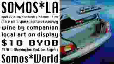 Somos*LA <> Dance Floor Gallery All the way from Brasil -- Somos*World touches down in LA for their first party of the year. We're opening the night at 7:30pm with art on display from local artists. Accompanied by a mid-tempo playlist and wine by the glass or bottle. At 9:00pm we'll start heating up the dance floor. Our resident DJs are known for a top selection of b-side dance tracks -- so come ready to move. We've got hours of music prepared for you. The event space is an art gallery by day. Furnished with cocktail tables thoughtfully arranged to bring people together. $10 Entry. *BYOB*. Feel free to bring whatever. There’s actually a fire liquor store on the corner. And for those who are interested, we are partnering with Companion to bring you a fantastic wine list. Schedule Doors at 7:30pm Dance floor 9pm - until whenever Artists