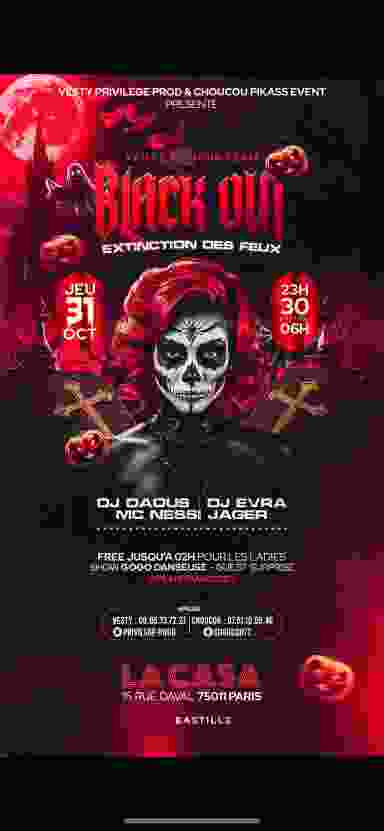 Halloween Black Out Jeudi 31 octobre, 23:30 - 06:00 Mixed by Dj Daous - Dj Evra - Mc Nessi Jager 15 rue daval, Paris 11 - Metro : Bastille Infoline : 06.89.14.27.93 Instagram :