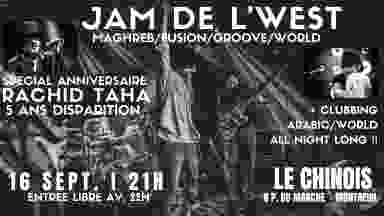 ⎃⎃ SOIREE MAGHREB/ORIENTALE avec JAM DE L'WEST ⎃⎃ ⏈ spécial ANNIVERSAIRE RACHID TAHA (5 ans disparition) ⏈ #arabe #maghreb #oriental #sahara #mediterranée #rai #chaabi ∲∲∲ SAM. 16 SEPT. ∲∲ 21H-5H ∲∲ LE CHINOIS (Montreuil) ∲∲∲ ◍◍◍◍◍◍◍◍◍ ARTISTES ◍◍◍◍◍◍◍◍◍ Live Band : ⏈ JAM D L'WEST + GUESTS ⏈ (Live / Groove Méditerranéen / Maghreb) ∲∲ CLUBBING MAGHREB ET ARABIC VIBES ∲∲ ⏈ DJ CUCURUCHO (Arab sounds & Electro-oriental) ⏈ ⏈ MKLF (Maghreb beats / House / Electronic) ⏈ ⏈ GROOVALIZACION DJs (Oriental & Arab-beats) ⏈ ∲∲∲ SAM. 16 SEPT ∲ 21H-5H ∲∲∲ENTREE LIBRE AV. 22H (7€ après) - CLUBBING 10€ dès 23H LE CHINOIS, 6 place du Marché - Montreuil M° Croix de Chavaux Preventes -->> SOON !! Bal Maghreb/oriental pour voyager vers les sonorités de l'Afrique du Nord, le Monde Arabe et la Méditerranée jusqu'au Moyen Orient et l'Asie avec des reprises des chansons phares de RACHID TAHA. En deuxième partie de la soirée des DJs jusqu'à l'aube avec du groove made in Maghreb, raï ou arab disco, en passant par l'électro, l'oriental funk ou la techno et la house aux influences du monde arabe pour traverser toute la Méditerranée du Maroc jusqu'à Turquie en passant par la Tunisie, l'Algérie, l'Égypte, la Syrie, Le Liban ou encore la péninsule Arabique jusqu'à l'Iran et au delà !! █ HISTOIRE ▀▀▀▀▀▀▀▀▀▀▀▀▀▀▀▀▀▀▀▀▀▀▀▀▀▀▀▀▀▀▀▀▀▀▀▀▀ Rachid Taha nous quittait de façon inattendue le 12 septembre 2018. L’immense artiste franco-algérien grâce à qui le rock avait pu, au coeur des années 80 (d’abord avec le groupe Carte de Séjour, puis en solo), rencontrer la musique traditionnelle algérienne. Rachid Taha avait, aussi et parmi cent autres proches, contribué à populariser le raï avec le superband 1, 2, 3 soleils, mêlé sa rage et sa poésie aux machines de Brian Eno, croisé le micro avec Rodolphe Burger (le projet Couscous Clan), parcouru le monde afin de lui offrir ce qu’il avait de plus précieux : sa lutte pour un monde plus métissé, plus juste, plus vivant. (Radio Nova) █ LINE UP ▀▀▀▀▀▀▀▀▀▀▀▀▀▀▀▀▀▀▀▀▀▀▀▀▀▀▀▀▀▀▀▀▀▀▀▀▀ ∲∲ LIVE BAND ∲∲ ⏁ JAM DE L'WEST + GUESTS (Groove Méditerranéen / Maghreb/France) ⏁ La Jam de l'West est un collectif sans frontières à l'initiative des musiciens du goupe Maghreb groove Bab El West. Pour cette soirée du 16 septembre ils proposent une édition spéciale hommage à leur cher ami RACHID TAHA, disparu il y a 5 ans le 12 septembre 2018. Ils seront accompagnés par des nombreux invités pour célébrer l'héritage de cette énorme figure de la musique française et maghrébine avec les classiques de son immense répertoire. https://www.facebook.com/jamdelwest ∲∲ CLUBBING MAGHREB ET ARABIC VIBES 23H-5H ∲∲ ⏈ DJ CUCURUCHO (Arab sounds & Maghreb grooves) ⏈ Co-fondateur de Radio Groovalizacion et basé Paris, nomade sonore spécialiste de la sono-tropical et les fusions improbables entre la musique afro, caribe, latin, arabe ou indien avec des rythmes urbaines globaux... Ce véritable groove-trotter a partagé des soirées avec artistes internationales comme Bomba Estereo, Seu Jorge, Balkan Beat Box, Salif Keita, Systema Solar, Dhoad Gypsies of Rajasthan, La Yegros ou Chicha Libre. Showcase au Womex 2013. https://www.facebook.com/djcucurucho http://www.mixcloud.com/musicasmigratorias ⏈ MKLF (Maghreb beats / House / Electronic) ⏈ MKLF défend une House mélodique et ensoleillée et vous concoctera un set spécial oriental vibes pour cet événement sous l'influence de ses racines ! Ses multiples influences lui permettent d’épicer ses sets par des touches ethniques, le tout accompagné d’instruments à percussions utilisés en live. Son amour pour la musique et son envie de la partager poussent le jeune artiste à s’exprimer avec autant de passion que d’énergie. La musique d’MKLF vous fera vivre une expérience sensorielle unique et vous transportera jusqu’au bout de la nuit ! http://www.instagram.com/mklf.dj http://www.soundcloud.com/dj-mklf http://www.facebook.com/DjMKLF ⏈ GROOVALIZACION DJs (Oriental & Arab-beats) ⏈ Groovalizacion est un collectif de DJs, journalistes et activistes culturels du monde entier dont les podcasts et Dj sets mettent en évidence les dernières tendances mondiales de musique urbaine et explorent leurs racines locales de l'Afrique à l'Amérique Latine en passant par le Monde Arabe, les Caraïbes ou la Méditerranée. Le collectif et leur web-radio a été créé en 2008 pour promouvoir des rencontres culturelles et l'expérimentation à travers les global grooves. Welcome to the Groovalizacion era amigos !! https://www.facebook.com/GroovalizacionRadio/ https://www.groovalizacion.org https://www.mixcloud.com/Groovalizacionradio https://soundcloud.com/groovalizacion █ INFOS PRATIQUES ▀▀▀▀▀▀▀▀▀▀▀▀▀▀▀▀▀▀▀▀▀▀▀▀▀▀▀▀▀▀▀▀▀▀▀▀▀ LE CHINOIS 6 place du Marché - Montreuil Métro Ligne 9 // Croix de Chavaux // Sortie 5 Place du Marché Bus 102, 122, 127