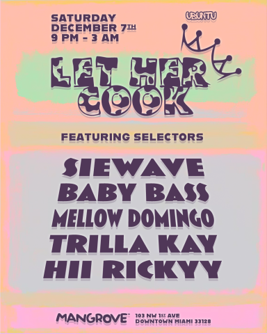 his Saturday, December 7th, bring the energy and join us for LET HER COOK at Mangrove! With a lineup of all female DJs with Siewave, Baby Bass and Hii Rickyy. With guest DJ Trilla Kay from DC and Mellow Domingo from NYC