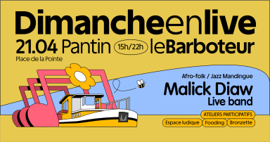 Dimanche en Live! esprit mandingue pour cette nouvelle édition du 21 avril ! Cette fois-ci le Barboteur s’habille en vert jaune rouge et accueille Malick Diaw & his band pour un live afro-folk, souvent mandingue, parfois touareg… et une belle après-midi ensoleillée à Pantin !
