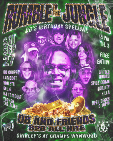 DB COOPER’S BIRTHDAY CELEBRATION!! DB Cooper all night b2b with: Lamebot Violeta Sel. 6 DJ Tamsom Topher the Alien Winter Wrong Spice Crime Duality Xilla Open decks 9pm-10pm