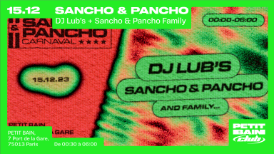 OUVERTURE DES PORTES : 00h30. Sancho & Pancho est de retour à @Petit Bain le 15 décembre pour couler la péniche ! 🛳️⚓️ Pour la dernière de l’année, on vous accueille en famille avec des dj sets, de la danse, des lives et quelques surprises 💃🏼🕺🏼🎤 @Dj Lub’s nous fait l’immense honneur de venir du Canada pour un dj set très shatta 🔥 Comme d’habitude on va rebola sur du Shatta, Dancehall, Bouyon, Soca, Baile Funk, Dembow… Préparez-vous à suer 🥵🥵 DJ Lub's est un DJ et producteur de musique de renommée internationale avec plus de 10 ans d'expérience dans l'industrie. Ses influences afro-caribéennes se reflètent dans sa musique, qui combine des sons et des rythmes inspirés de différentes cultures pour créer une expérience musicale unique. DJ Lub a accumulé plus de 18 millions de vues sur YouTube et plus de 10 millions de streams sur des plateformes telles que Spotify, SoundCloud, Apple Music et Deezer. Il a été l'un des premiers DJ de dancehall à dépasser les 6 millions de vues sur YouTube avec son mix "Watch out Fi Dis". Sancho & Pancho est un duo de DJ, un collectif et un label de musique. Sancho & Pancho joue essentiellement une musique mondiale et moderne (Baile Funk, Dancehall, Shatta, Afrobeat, Batida, Dembow, Bouyon...) en soirées, en playlists et en radios dans le cadre de sa résidence Rinse : Dans la Sauce. Inspiré par les esthétiques musicales les plus radicales, les plus festives et les plus dansantes, Sancho & Pancho n’aspire qu’à faire respecter leur devise : Condamné à faire suer. ---------------------------------------------------------------------- Petit Bain est un lieu festif et accueillant. Il défend des valeurs d’égalité, de partage, de respect et de bienveillance. Toute l’équipe défend ces valeurs et nous invitons vivement que les publics, artistes et collaborateurs·rices du lieu en fassent de même. L'organisation ne tolère aucun comportement agressif, violent ou discriminant, pouvant entraîner le refus d'entrée ou l'expulsion. - Interdit aux moins de 18 ans -