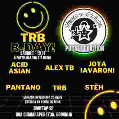 Por último falamos do aniversariante, o DJ TRB, que faz 42 anos e tem 21 anos de carreira como DJ. Para quem não o conhece bem por ser de uma geração mais antiga que a atual, ele é o fundador do TechnoPride (2002) e graças ao seu trabalho pode criar o selo TechnoPride Records que teve sua distribuição mundial e lançou 09 discos de vinil. Durante sua carreira já esteve em algumas tours pela Europa passando por Eslovênia, Croácia, Alemanha, Espanha, Portugal, Hungria entre outros eventos. Alguns destes eventos ao lado de seu amigo de longa data Alex TB. Então comemorar este dia juntando geração mais velha e nova é idéia sua, mostrando que independente do tempo o Techno nunca para, sempre evolui.