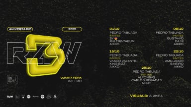 Em outubro, o Porto vai tremer como nunca. A R4W celebra o seu 3.º aniversário e transforma todo o mês numa festa contínua, 5 quartas-feiras, 5 noites irrepetíveis, com os convidados sempre em b2b com Pedro Tabuada. Este aniversário é especial porque marca não apenas a celebração de três anos de música sem filtros, mas também o reencontro e a união de uma família alargada que dá vida à cabine. É com enorme entusiasmo que damos as boas-vindas a todos os artistas que vão partilhar esta celebração: SY, Rui Trintaeum, Gusta-Vo, Da Ni, Vasco Valente, King Bizz, Amulador, Sineiro, Alfonsvs, Carlos Regadas e Aikko. Cada um deles traz consigo a sua identidade, a sua energia e a sua visão, tornando cada semana um encontro único, impossível de repetir. Juntos, vamos escrever novas histórias, criar momentos que ficam na memória e provar, mais uma vez, porque a R4W é hoje um ponto de encontro essencial da cena eletrónica portuense. Cinco semanas. Onze convidados. Um anfitrião. Uma celebração que é de todos nós. 🇬🇧 This October, Porto will shake like never before. R4W celebrates its 3rd anniversary, turning the whole month into a continuous party: 5 Wednesdays, 5 unrepeatable nights, always b2b with Pedro Tabuada. This anniversary is special, not only because it marks three years of raw, uncompromising music, but also because it brings together the extended family that keeps the booth alive. We are thrilled to welcome all the artists who will share this celebration: SY, Rui Trintaeum, Gusta-Vo, Da Ni, Vasco Valente, King Bizz, Amulador, Sineiro, Alfonsvs, Carlos Regadas and Aikko. Each of them brings their own identity, energy and vision, making every week a one-of-a-kind encounter that can never be repeated. Together, we’ll write new stories, create memories that last, and prove once again why R4W has become a true meeting point for Porto’s electronic community. Five weeks. Eleven guests. One host. One celebration that belongs to all of us.