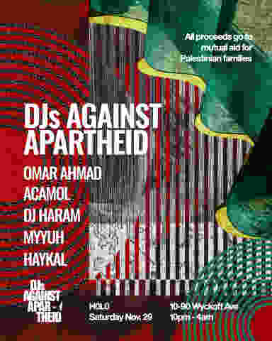 Join DJs Against Apartheid for a night of solidarity with Palestinian Liberation! On November 29th, we’re bringing together four incredible DJs—Omar Ahmad, DJ Haram, Acamol, and Myyuh—for a night of music, resistance, and community.