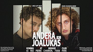 KÖMMA: Andera b2b Joalukas (all night long) Paris Fashion Week Wednesday 4 Mars 2026 Dress code : Casual Chic. (Please respect the dress code) RESERVATION TABLE : Téléphone: 06 12 15 78 19 (whatsapp) IG : https://www.instagram.com/komma_paris/ Mirage Paris 65 Rue Pierre Charron 75008 Paris