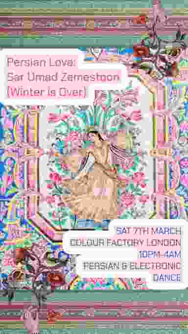 Mehmooni LDN honcho Milli & Makaan Techno Trailblazer Anahita Shamsaei bringing underground Tehran to Hackney Wick for a special all night long journey through Persian Disco, Psychedelic Tribal BANDARI and pulsating techno that screams freedom and resistance sounds. Sar Umad Zemestoon (Winter is Over) is a Persian poem that highlights the coming of the spring equinox and the hope for better days.
