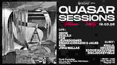 Maison Quasar présente les « Quasar Sessions Ep. 1 » On s'est lancé le défi de produire un EP 💿 entièrement maison: de la prod au clip en passant par l'enregistrement et le mix, tout le projet a été réalisé au sein des studios 3S. Pour fêter la sortie de l'EP on vous donne rendez-vous pour une soirée alliant performances live et DJ set. LIVES: - ODZIE - OZALEJI - FCM - JEUNEDOOMER - SWAN21CORAZON & JALEB - KUN - JOHA WALLAS DJ SET: - KHALIL - DEUZENN - ZOOVIE KAZUYOSHI - DISCJOCKEYHELO