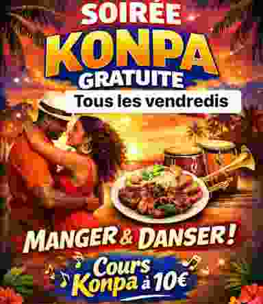 Soirée dansante konpa gratuite Pour celles et ceux qui veulent apprendre le konpa. Un cours de konpa est proposé en début de soirée; 21h30-1h: soirée konpa 20h30 à 21h30: cours konpa à 10€ Possibilité de manger haïtien sur place